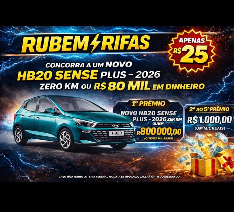 RIFA HYUNDAI HB20 0KM OU R$80.000 SORTEIO SÁBADO DIA 07/03/2026 LOTÉRIA FEDERAL