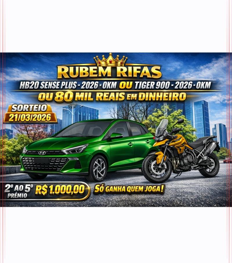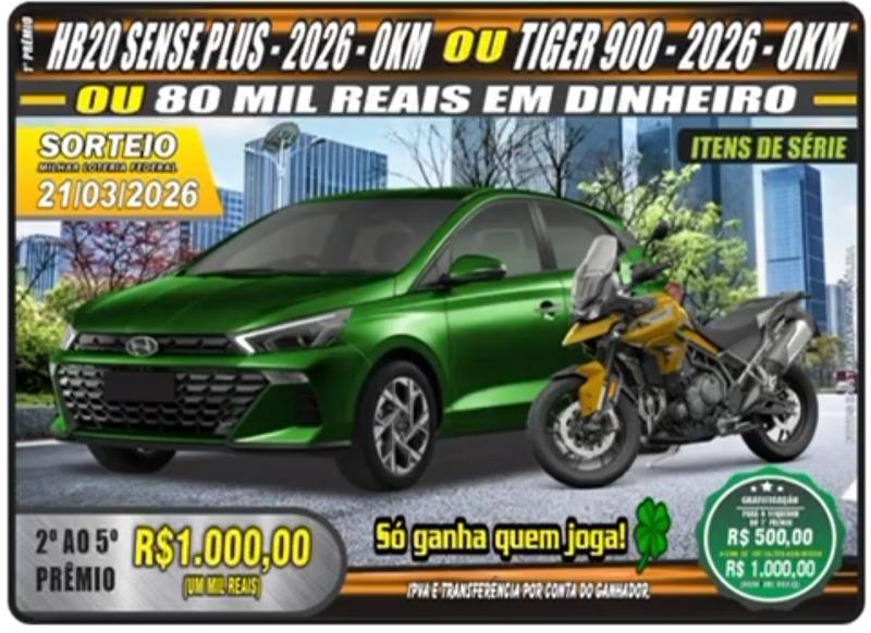 RIFA HYUNDAI HB20 0KM OU TIGER-900CC 0KM OU R$80.000 SORTEIO 21/03/2026